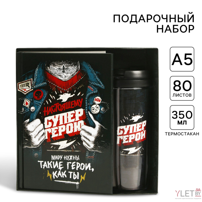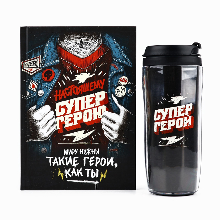 Подарочный набор: ежеднкевник в твердой обложке А5, 80 л. И термостакан 350 мл «Супер герою»
