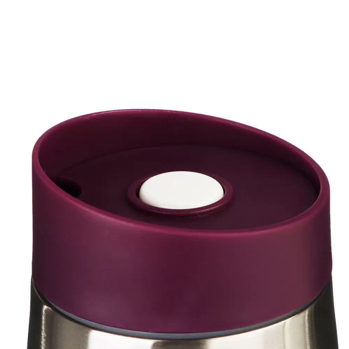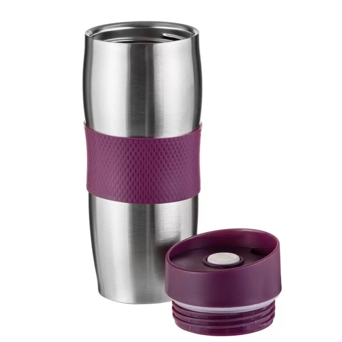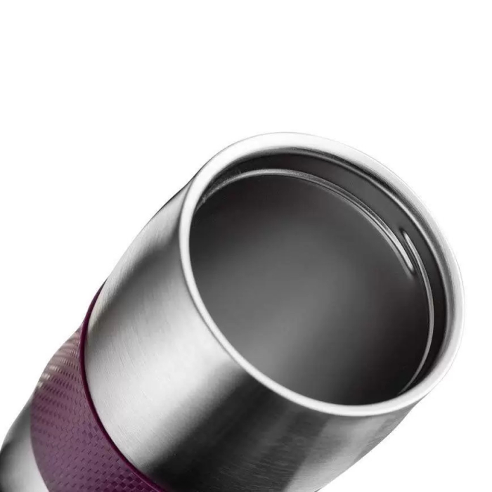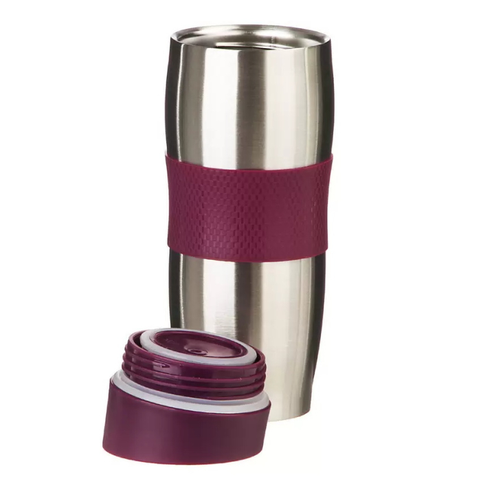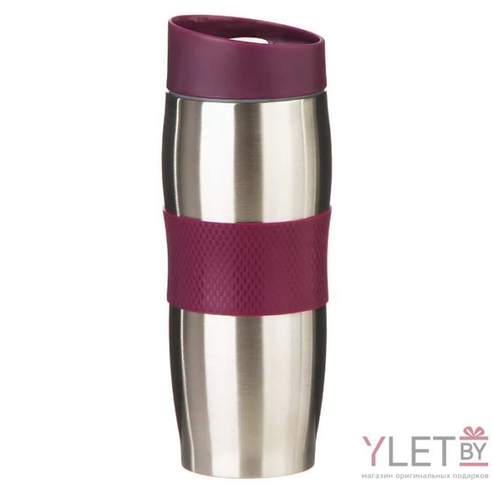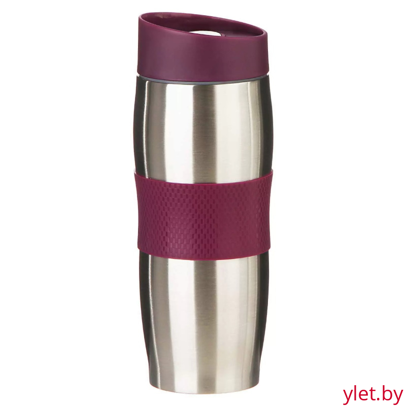 Корпус с двойными стенками из высококачественной нержавеющей стали. Цвет крышки: фиолетовый. Цвет корпуса: стальной. Вакуумная колба из высококачественной нержавеющей стали. Крышка из высококачественного пластика на резьбе, с поилкой. Кнопка открывания/закрывания клапана. Оригинальный механизм не допускающий протекания жидкости даже в случае опрокидывания кружки. Противоскользящее покрытие дна. Сохраняет температуру в течение 4-5 часов.