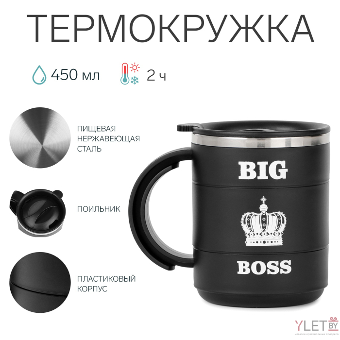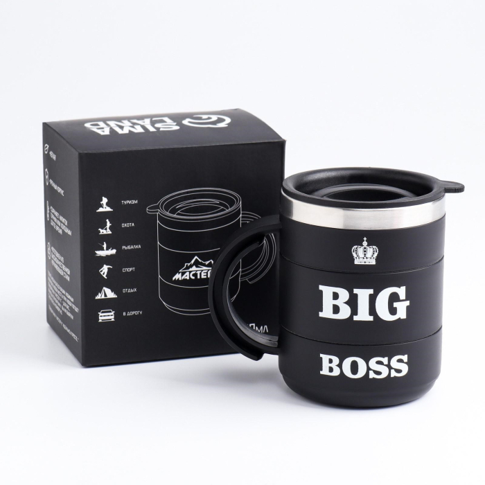 С термокружкой "BIG BOSS" ваши напитки всегда будут под рукой, а стильный и современный дизайн подчеркнет вашу уверенность и статус. Наслаждайтесь каждым моментом и стилем жизни!