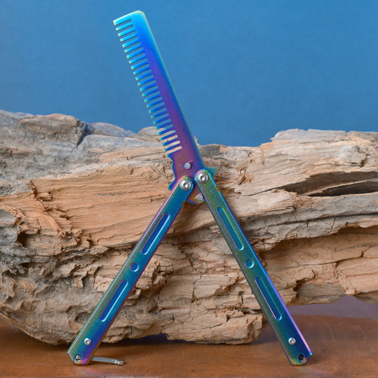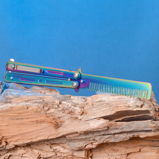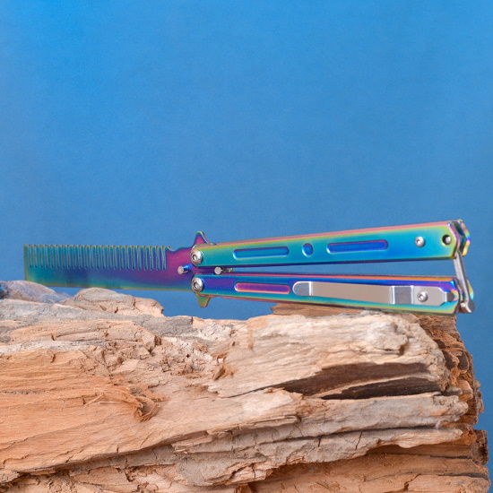 Расчёска бабочка это необычного вида нож, где вместо лезвия у него расческа. Отлично подойдет для тех, кто решил заняться флиппингом (необычные трюки с бабочкой), но не уверен или боится случайно порезаться в процессе обучения.