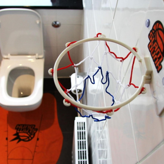 - Универсальность применения. Мини-баскетбол для туалетной комнаты – это не только спортивный инвентарь, это возможность декорировать комнату по своему вкусу.
