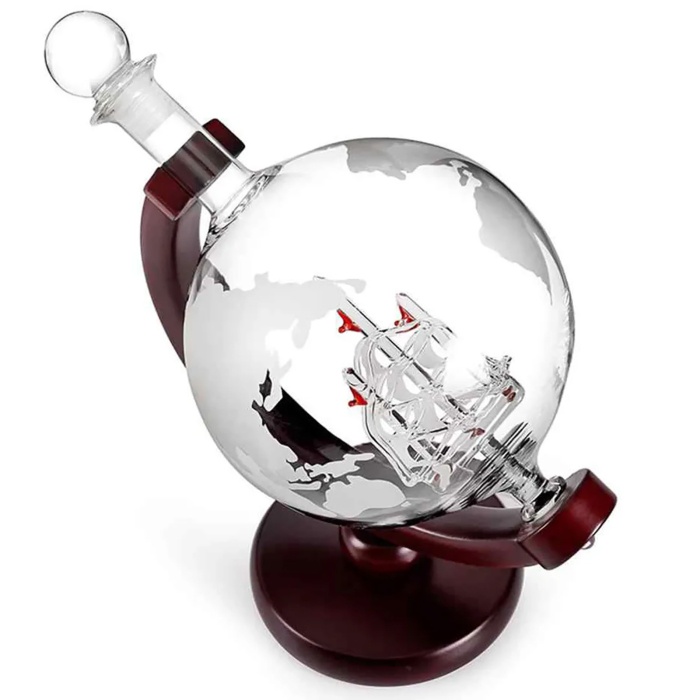 - Глобус-декантер: Исключительный декантер выполнен из прозрачного стекла, внутри которого величественно парит стеклянный парусный корабль. На стенках глобуса нанесена изящная серебристая карта мира, что делает каждую деталь по-настоящему уникальной. Этот элемент не только эстетически привлекателен, но и функционален, позволяя вам с гордостью демонстрировать свои любимые напитки.