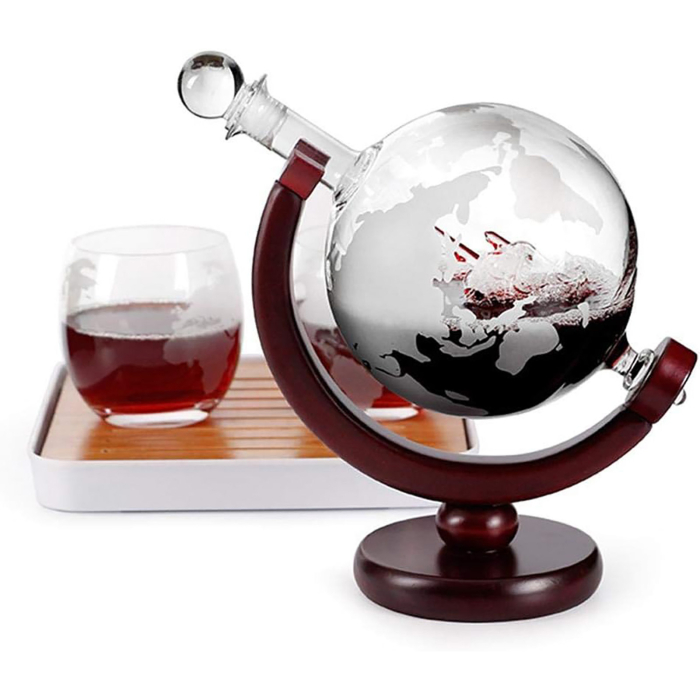 - Деревянная подставка: Удобная и стильная подставка обеспечивает стабильное вращение глобуса, позволяя вам легко наливать напиток, не беспокоясь о проливании. Она надежно удерживает декантер на месте и подчеркивает роскошь всего набора.