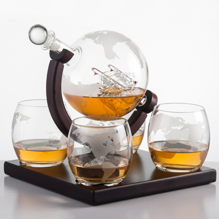 Внутри стеклянного глобуса расположился парусный корабль, выполненный с предельным вниманием к деталям. Этот элемент ручной работы добавляет нотку романтики и свидетельствует о вашей любви к морю и приключениям. Декантер декорирован картой мира, что делает его не только функциональным предметом, но и стильным аксессуаром.