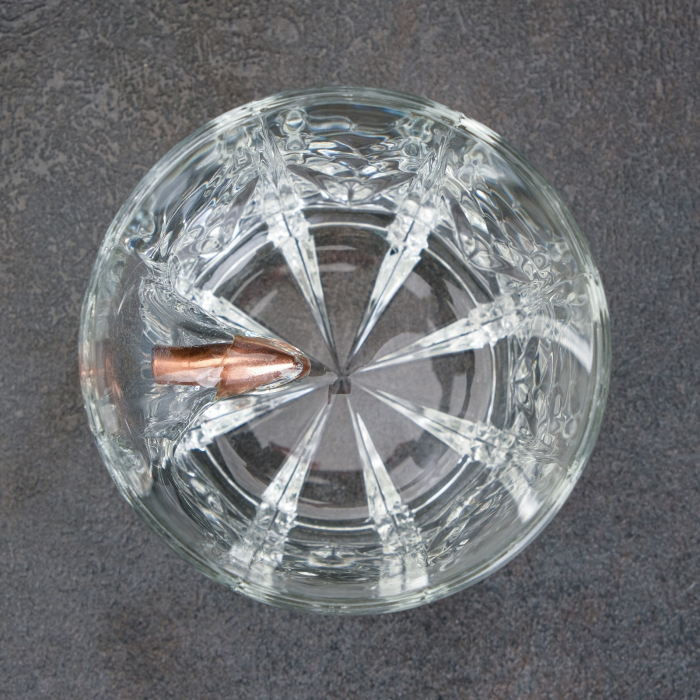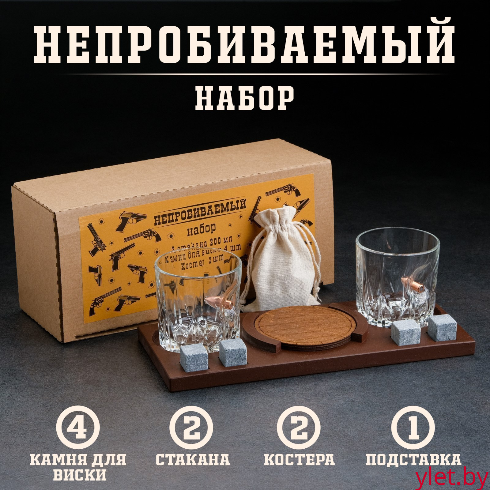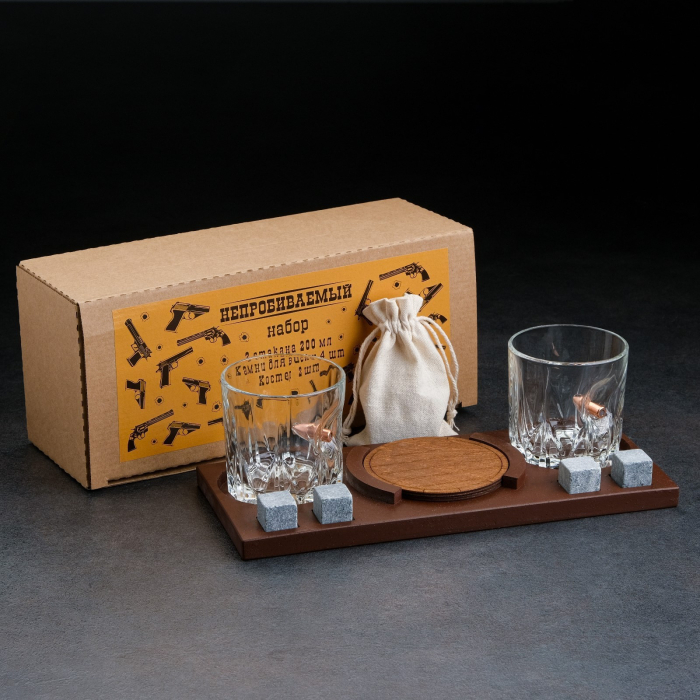 Набор "Непробиваемый", 2 стакана 200 мл с пулей, камни для виски 4 шт. в мешочке, подставка