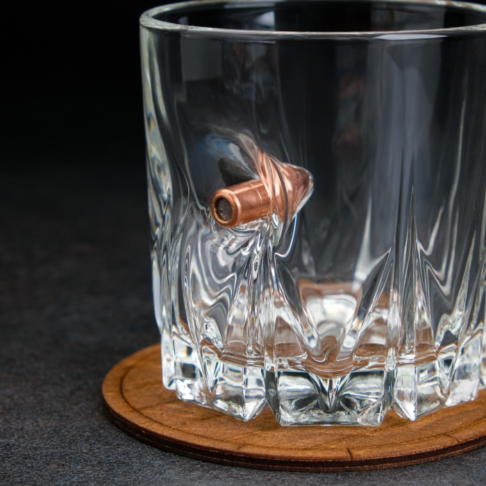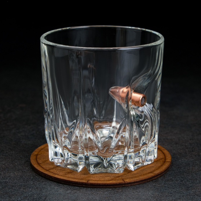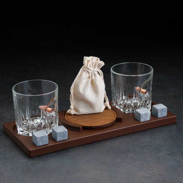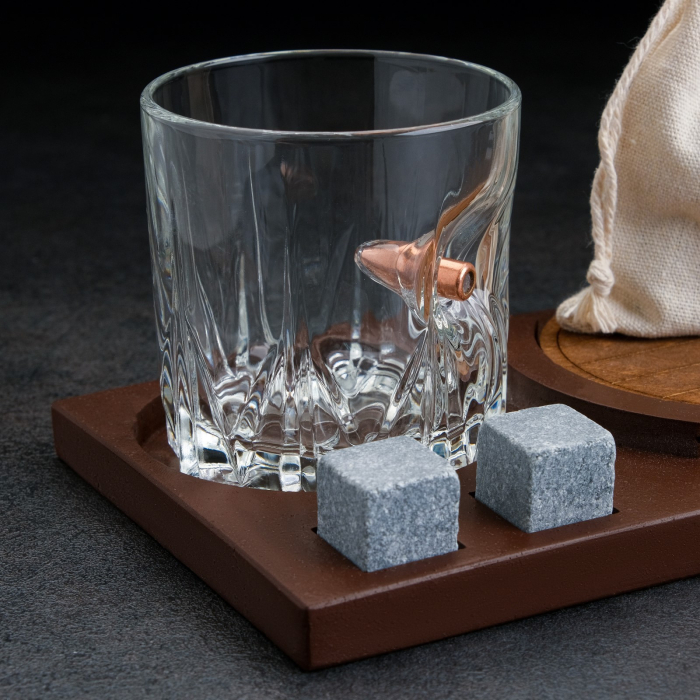 ---Набор "Непробиваемый", 2 стакана 200 мл с пулей, камни для виски 4 шт. в мешочке, подставка
