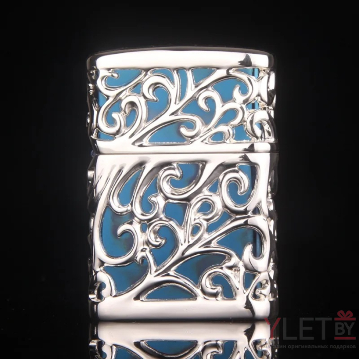 Яркий синий цвет придаёт зажигалке выразительность, а изысканный серебряный узор добавляет шарма и утонченности.